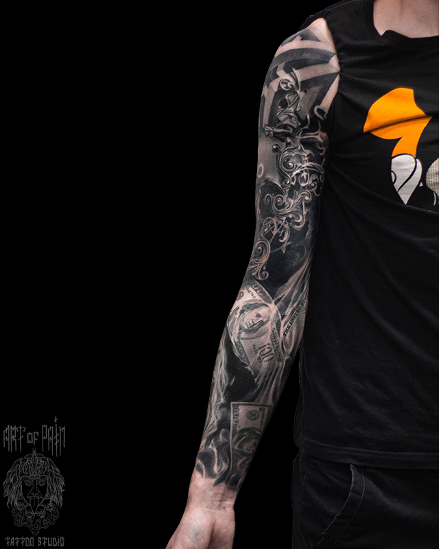 Татуировка мужская реализм тату-рукав доллары, дым (Вячеслав Плеханов) 6615
