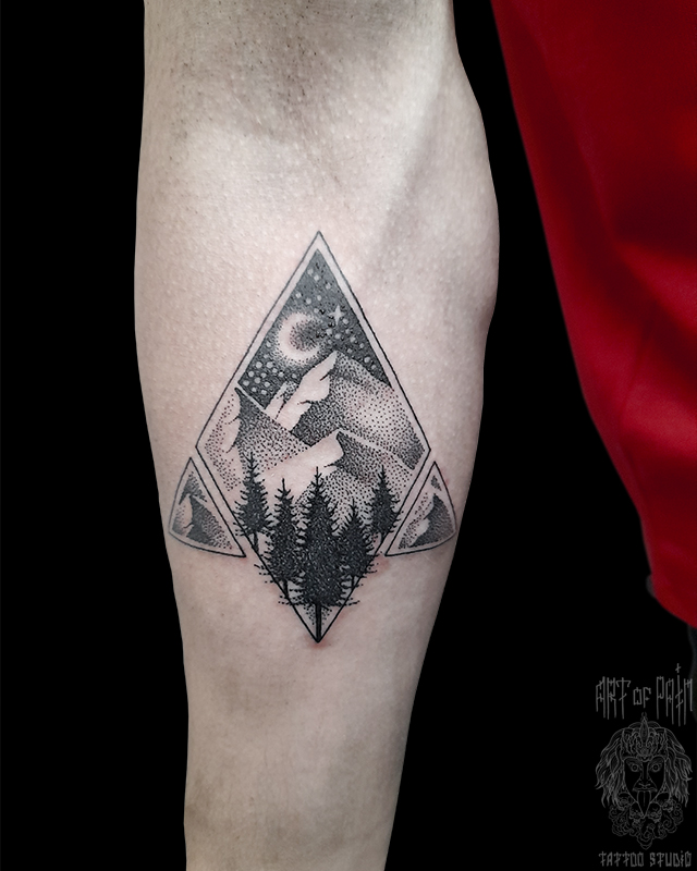 Татуировка мужская графика и дотворк на предплечье ночной пейзаж (Николай Орф) 6642