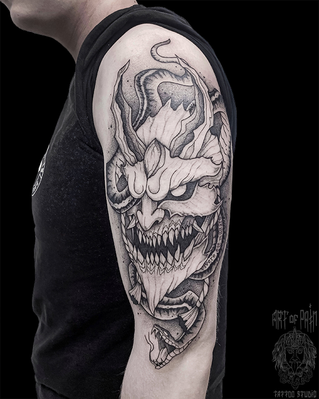 Татуировка мужская графика на плече демон и змея (Мария Котова) 6646