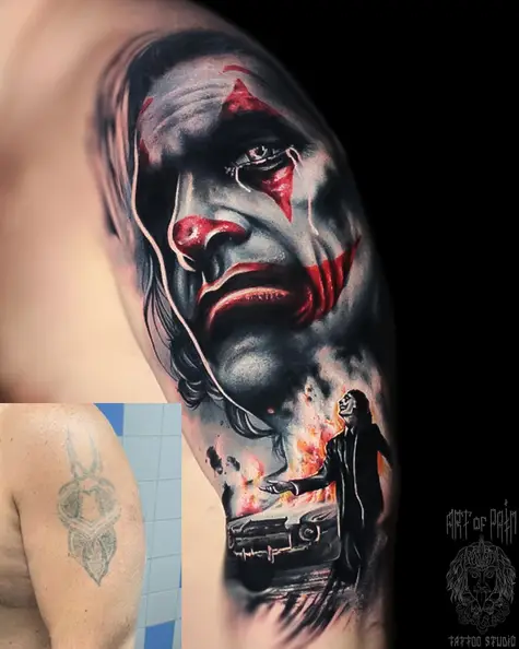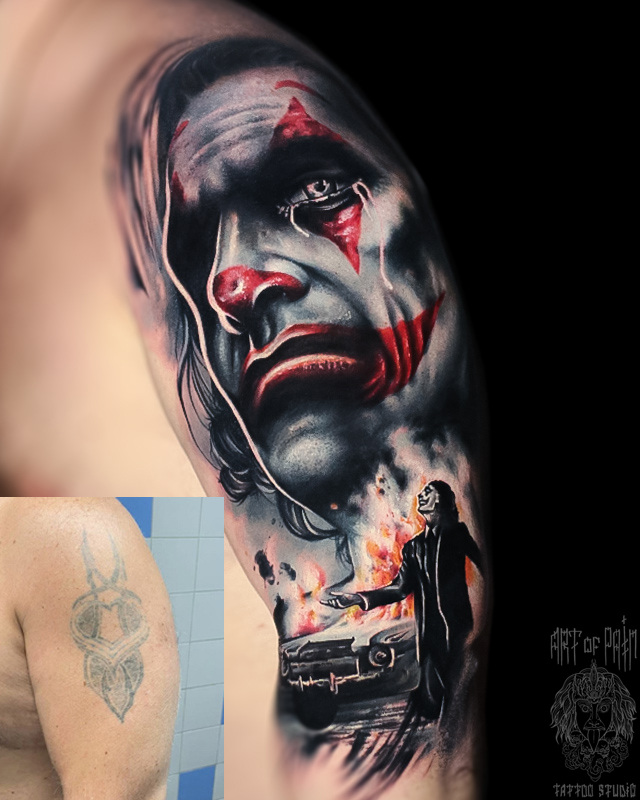 Татуировка мужская реализм на плече Джокер кавер (Дмитрий Шейб) 6677