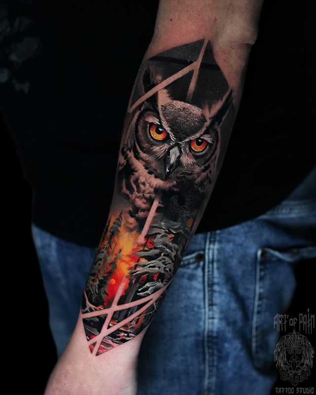 Татуировка мужская реализм на предплечье филин и лес (Анастасия Юсупова) 6691