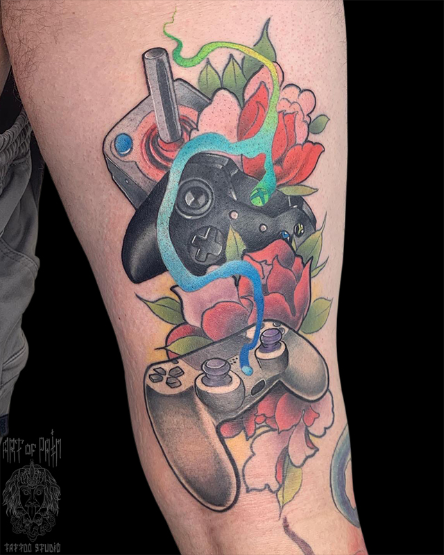 Татуировка мужская нью скул на бедре джойстики и цветы 6703