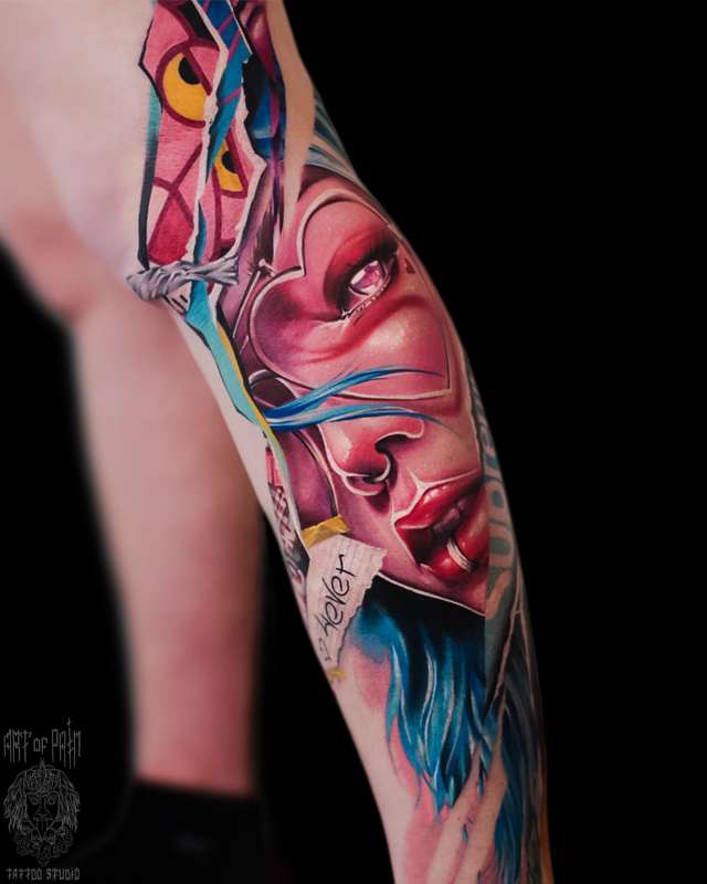 Татуировка мужская нью скул и реализм на ноге девушка и розовая пантера (Дмитрий Шейб) 6739