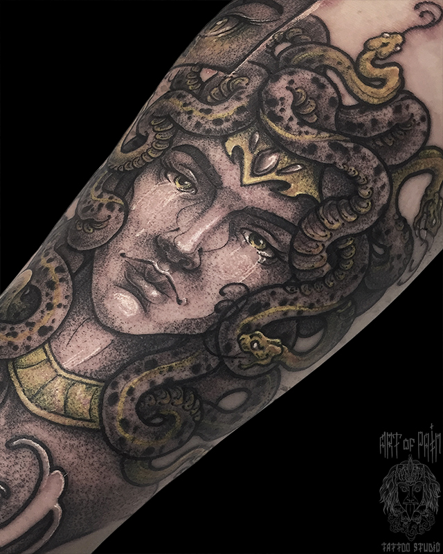 Татуировка мужская графика на предплечье Горгона Медуза (Денис Марченко) 6776