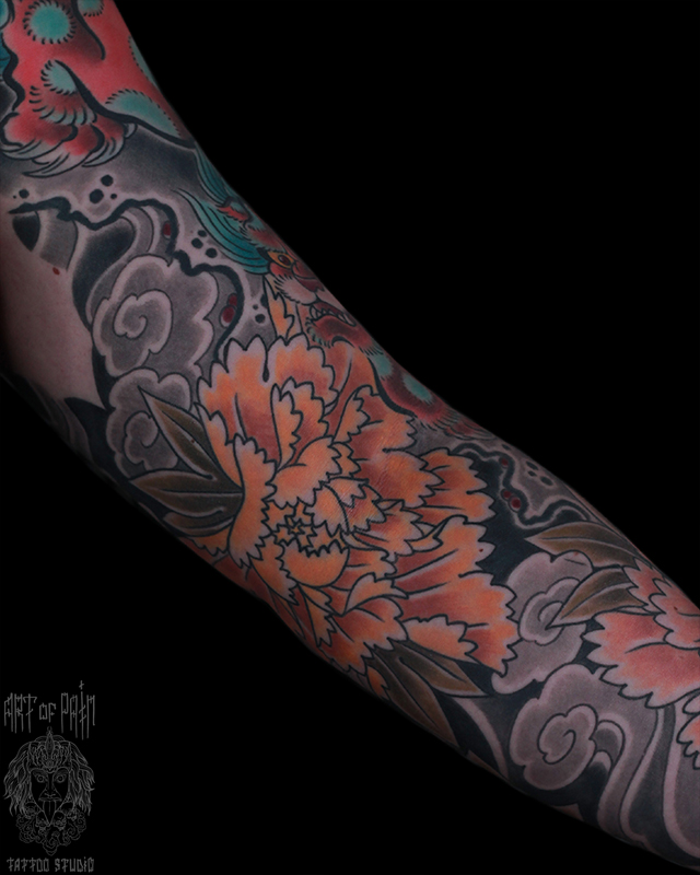 Татуировка мужская япония на предплечье пион 6800