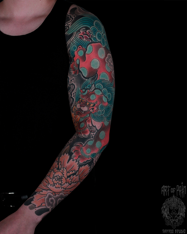Татуировка мужская япония тату-рукав лев и пион 6804