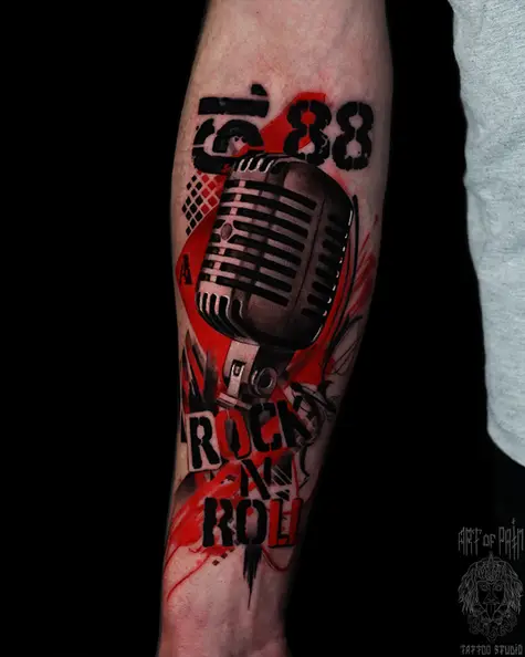 Татуировка мужская реализм и треш полька на предплечье надпись и микрофон (Анастасия Юсупова) 6810