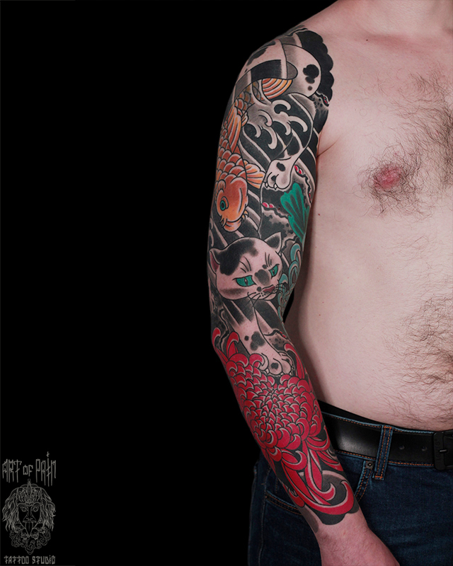 Татуировка мужская япония тату-рукав хризантемы, карп и кот 6844
