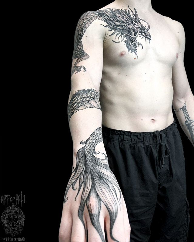 Татуировка мужская графика на руке и груди дракон (Анастасия Родина) 6855