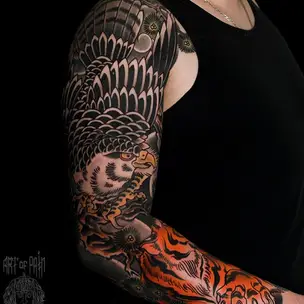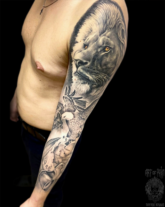 Татуировка мужская реализм тату-рукав лев и орел 6894
