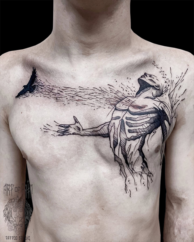 Татуировка мужская графика на груди человек и птица (Мария Котова) 6922