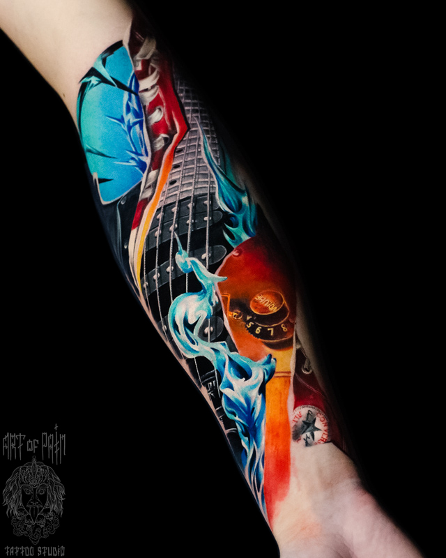 Татуировка мужская реализм на предплечье гитарный гриф (Дмитрий Шейб) 6933