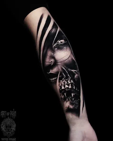 Татуировка мужская реализм на предплечье девушка и череп (Дмитрий Шейб) 6941