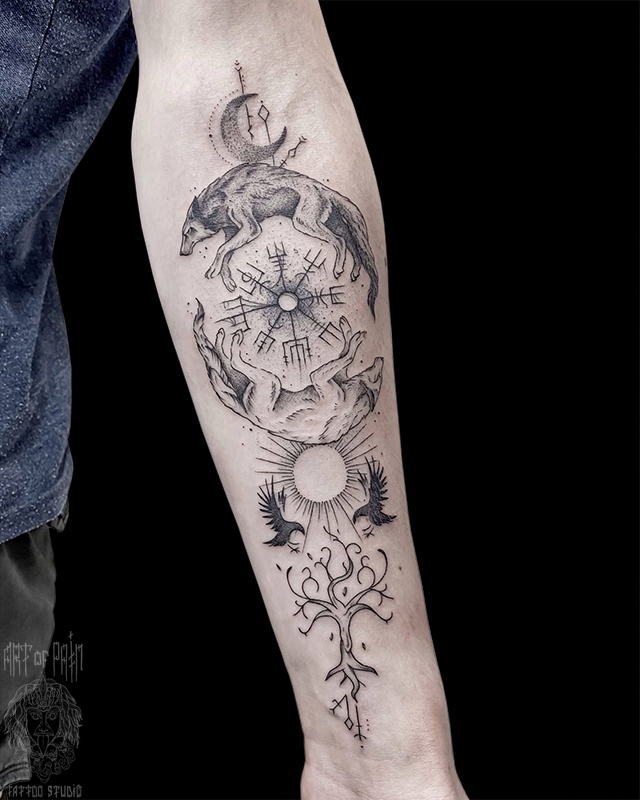 Татуировка мужская графика на предплечье волки, птицы, узоры (Мария Котова) 6968