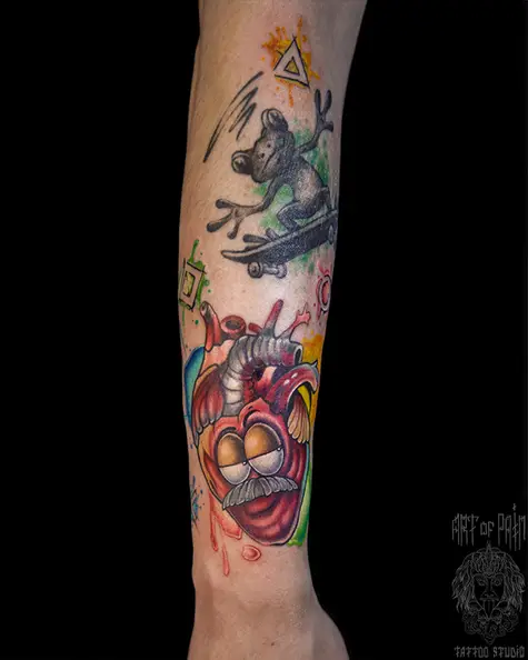 Татуировка мужская нью скул на предплечье лягушка на скейте и сердце 7001