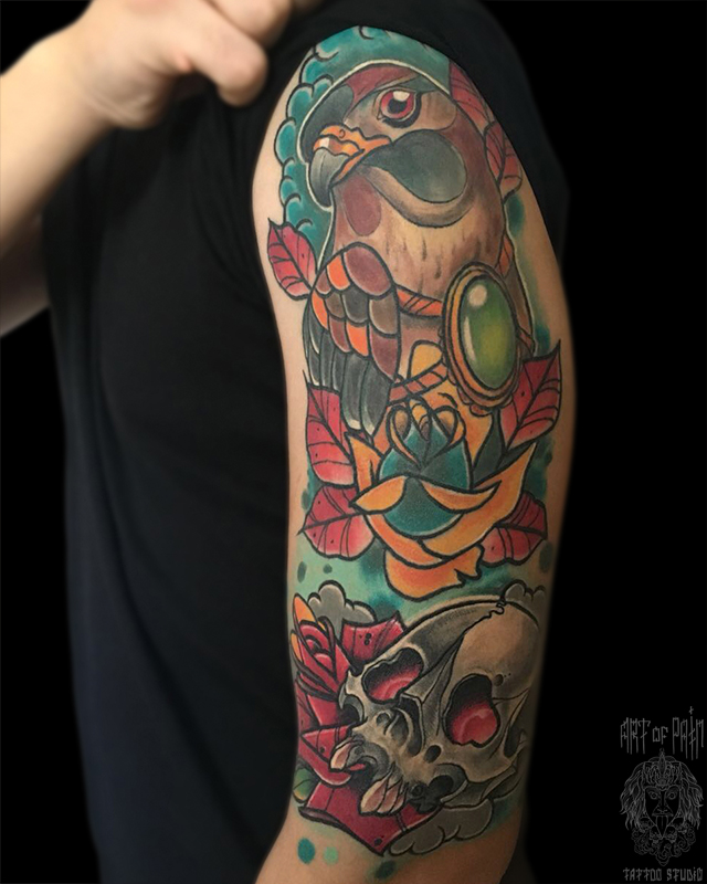 Татуировка мужская нью скул на плече птица и череп 7007