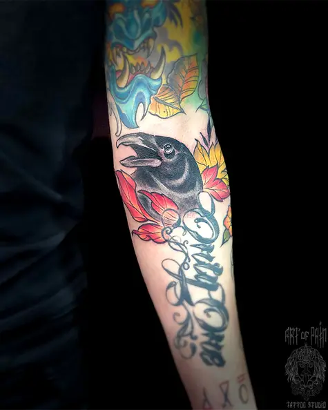 Татуировка мужская нью скул на предплечье ворон 7018