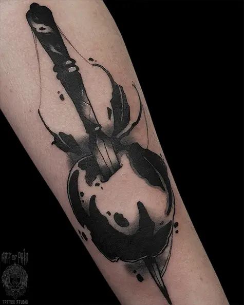 Татуировка мужская графика на предплечье кинжал и яблоко 7047
