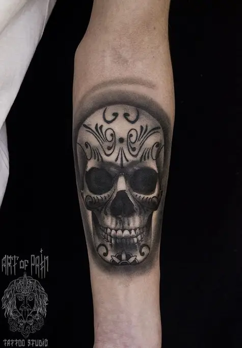 Татуировка мужская Black&Grey на предплечье череп в узорах 707