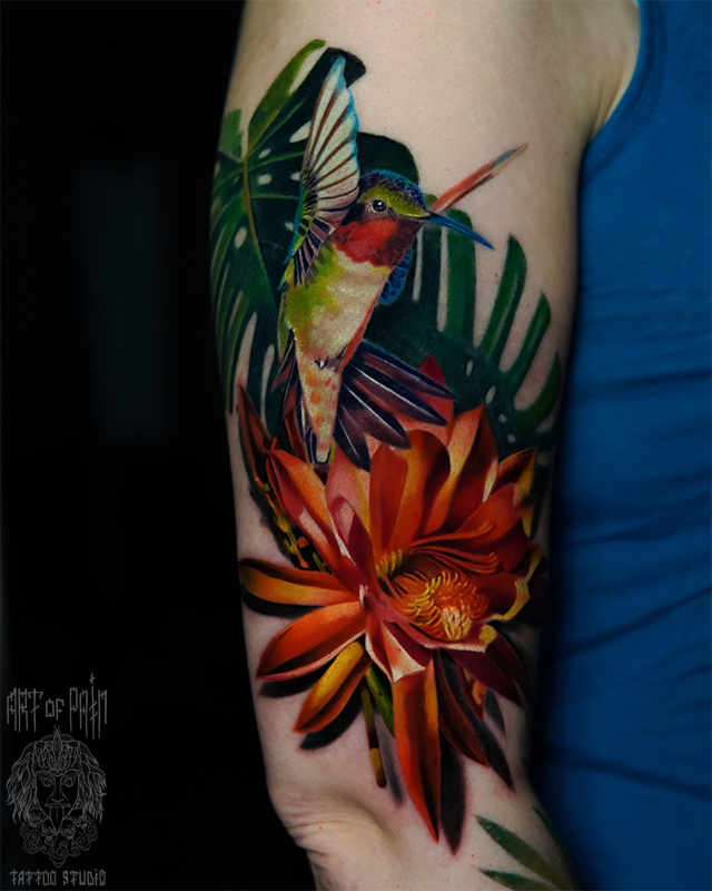 Татуировка мужская реализм на плече колибри и хризантема (Анастасия Юсупова) 7093