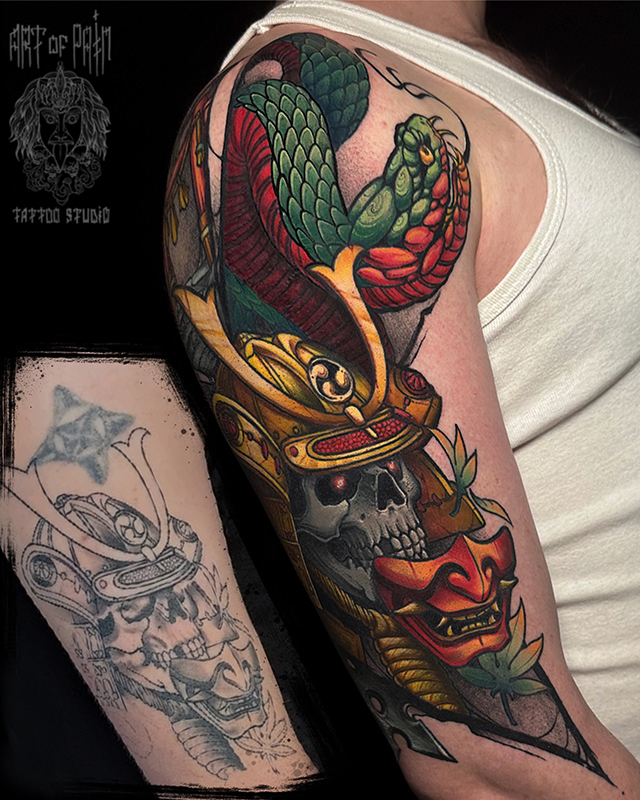 Татуировка мужская япония на плече череп и доспехи, змея (Денис Марченко) 7102