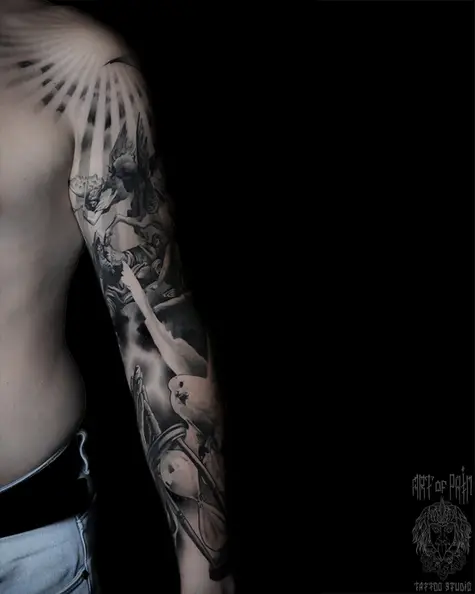 Татуировка мужская реализм тату-рукав ангелы, руки, часы 7113