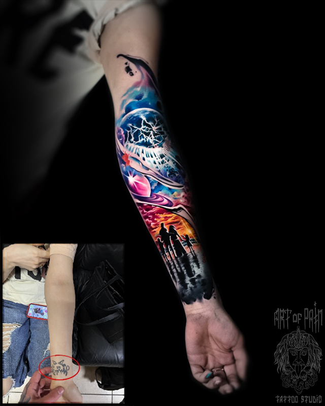 Татуировка мужская реализм на тату-рукав планеты, вселенная и семья (Дмитрий Шейб) 7128