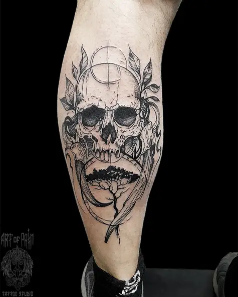 Татуировка мужская графика на голени череп и дерево (Николай Орф) 7187