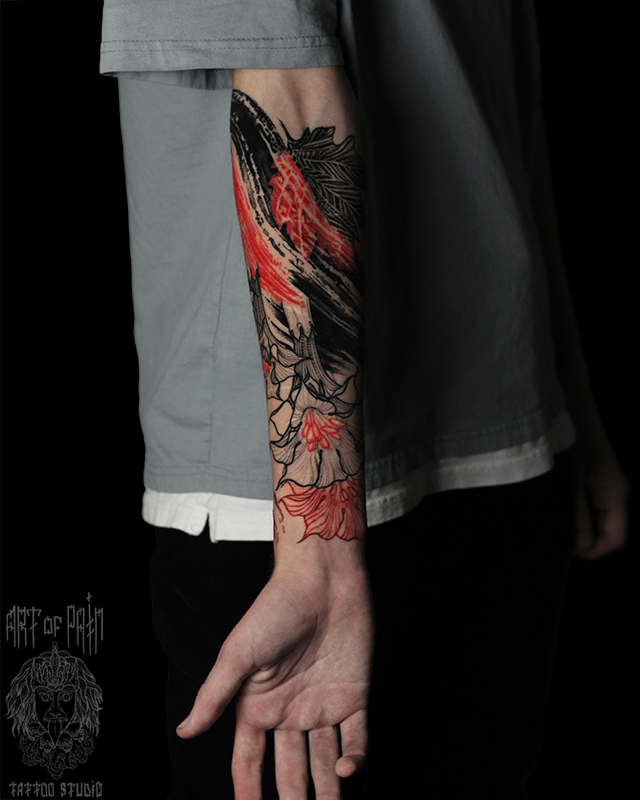 Татуировка мужская графика на предплечье цветы и глаз (внутренняя сторона руки) (Надежда Полякова) 7246