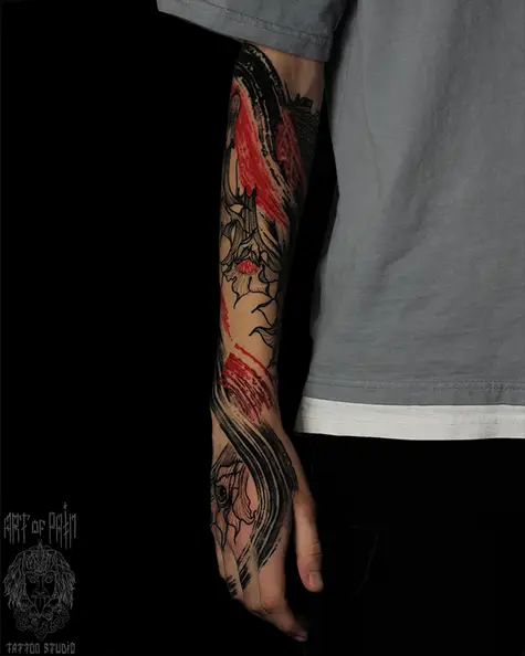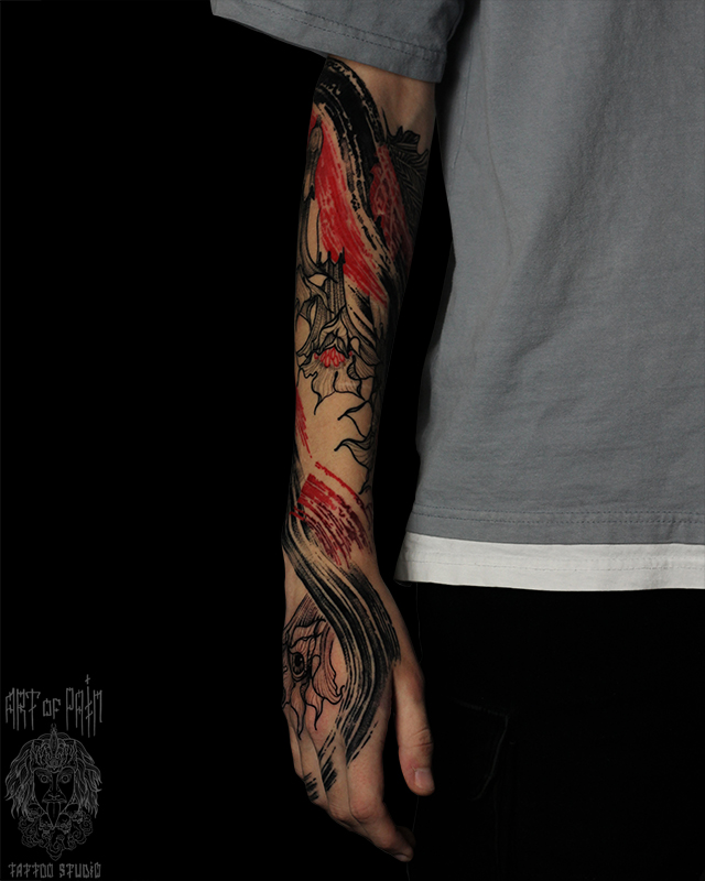 Татуировка мужская графика на предплечье цветы и глаз (вид спереди) (Надежда Полякова) 7247