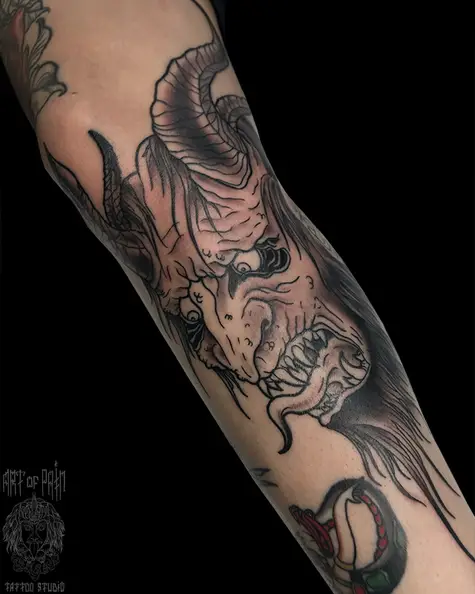 Татуировка мужская нью скул на голени чёрт 7351