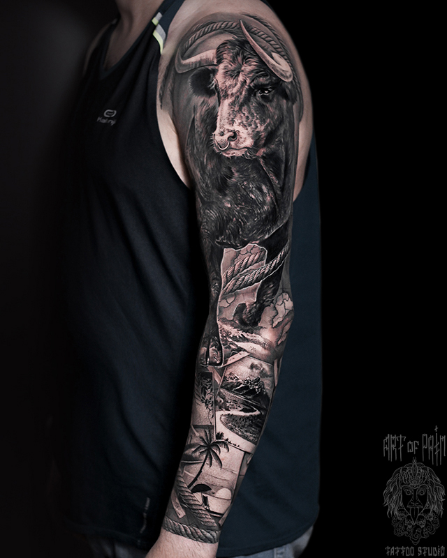 Татуировка мужская реализм тату-рукав бык, фотографии (Слава Tech Lunatic) 7392