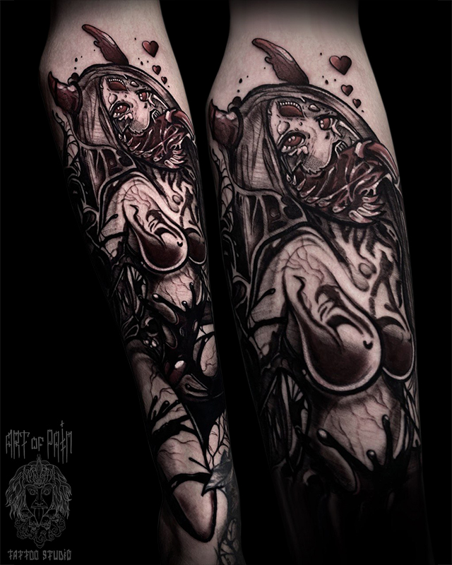 Татуировка мужская графика, хоррор на предплечье девушка-демон (Кирилл Плотников) 7393