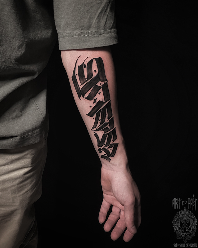 Татуировка мужская каллиграфия на предплечье надпись 7402