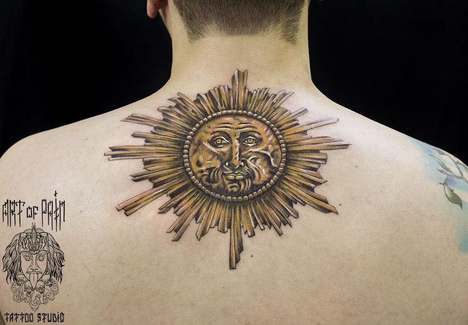 Татуировка мужская реализм на спине солнце 747