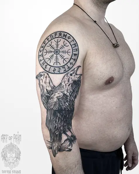 Татуировка мужская графика на плече вороны 7480