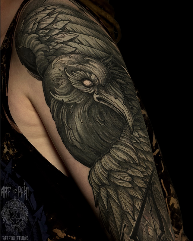 Татуировка мужская графика, нео-трад тату-рукав ворон (Денис Марченко) 7503