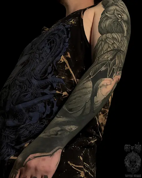 Татуировка мужская графика, нео-трад тату-рукав ворон (Денис Марченко) 7504
