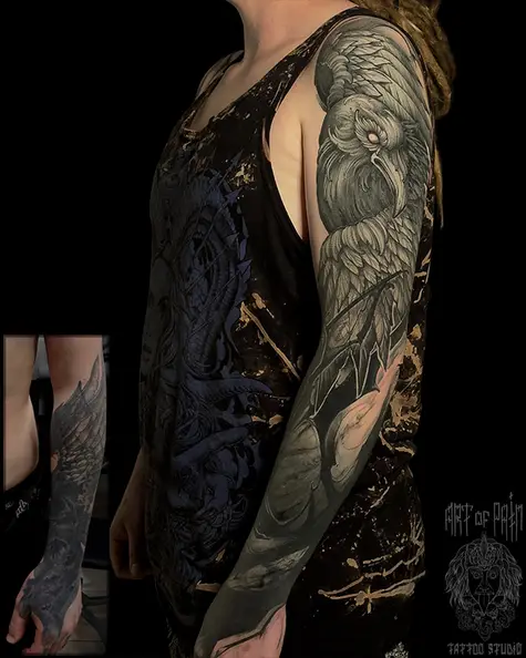 Татуировка мужская графика, нео-трад тату-рукав ворон (Денис Марченко) 7505