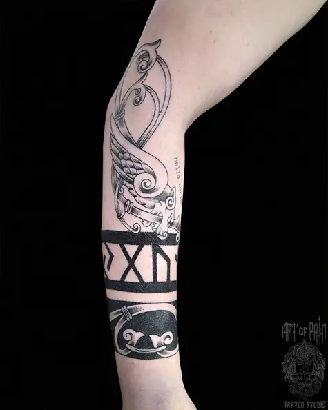 Татуировка мужская кельтика на руке лев и руны (Николай Орф) 7520