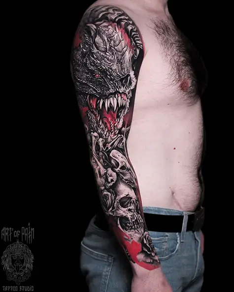 Татуировка мужская реализм и фентези тату-рукав дракон и черепа (Слава Tech Lunatic) 7536