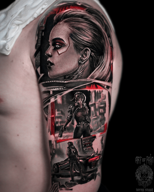 Татуировка мужская реализм на плече девушка и автомобиль (Слава Tech Lunatic) 7537