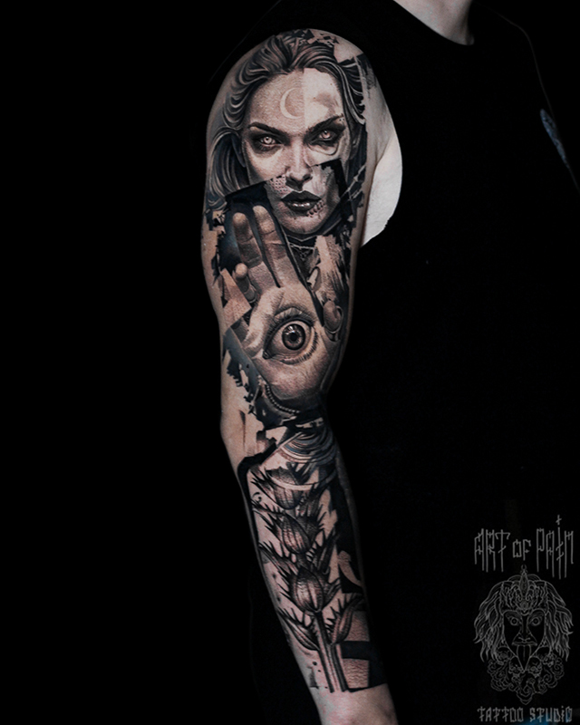 Татуировка мужская реализм тату-рукав девушка, рука, глаз (Слава Tech Lunatic) 7546