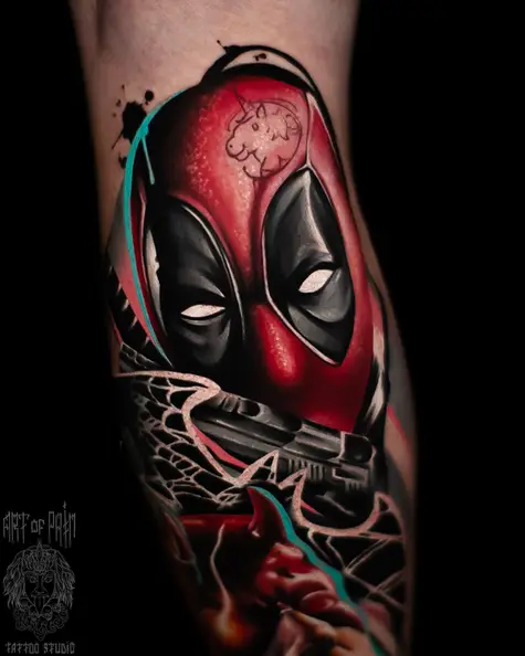 Татуировка мужская реализм на голени Дэдпул (Дмитрий Шейб) 7567