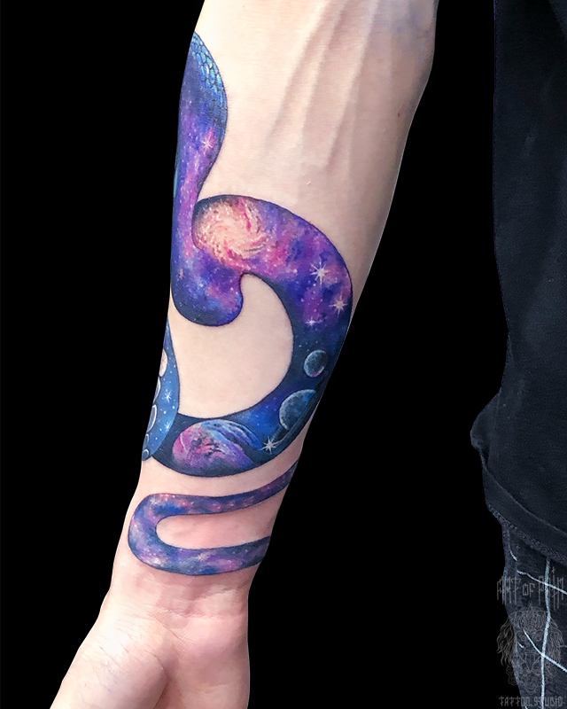 Татуировка мужская нью-скул на предплечье космическая змея (Анастасия Родина) 7584