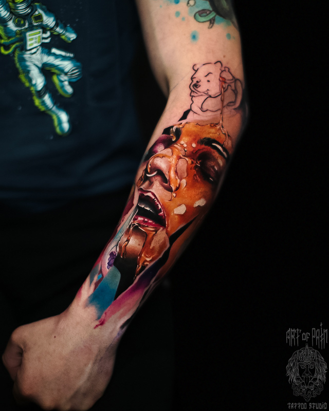 Татуировка мужская реализм на предплечье девушка и Винни Пух (Дмитрий Шейб) 7622