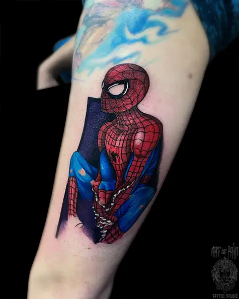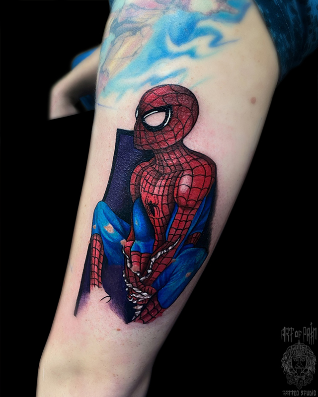 Татуировка мужская нео-трад на плече человек-паук 7640