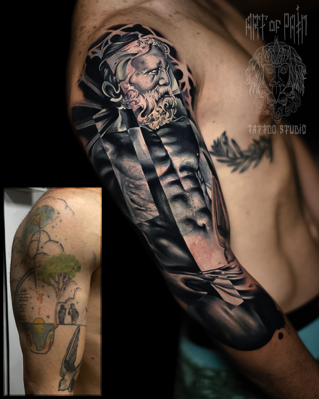 Татуировка мужская реализм на плече статуя (Дмитрий Шейб) 7679