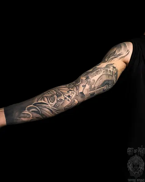 Татуировка мужская реализм и чикано тату-рукав, карты, автобус 7748