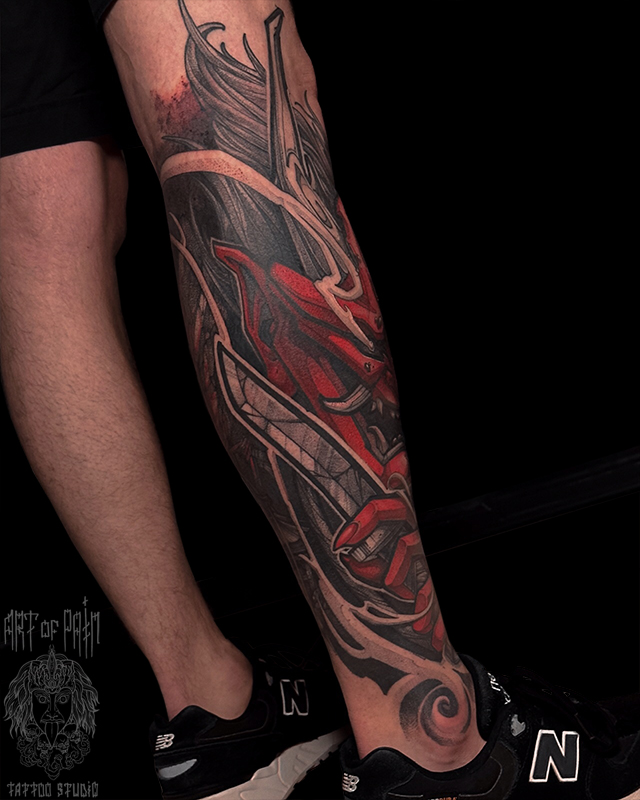 Татуировка мужская нео-япония на голени Они (Денис Марченко) 7783